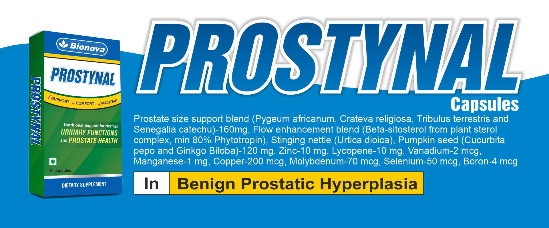 Prostynal Capsules stand out for their superior formulation, backed by research and quality assurance. Manufactured by Bionova, a trusted name in healthcare, Prostynal Capsules adhere to the highest standards of safety and efficacy. With a blend of natural and clinically proven ingredients, Prostynal Capsules offer a holistic approach to prostate health.